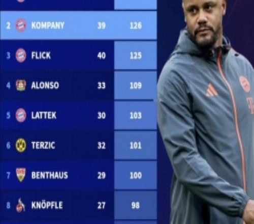 执教德甲前50场积分排名:孔帕尼第二仅次瓜帅,阿隆索上榜排第四